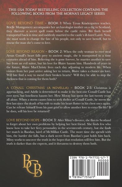 Love Beyond Time (Book 1): Nearly 400 years ago, the Conall clan and their people were murdered, their castle burned to the ground. In centuries following, archaeologists searched the ruins looking for any evidence of those responsible. Efforts were fruitless until a spell put in place by an ancient Conall ancestor finally began to work its magic... When Bri accompanies her archaeologist mother on a dig in Scotland, they discover a spell room below the castle ruins, and Bri is transported back in time and suddenly married to the castle's ill-fated Laird. She must work to change the fate of his people, all while trying to find a way to return to her century, but Bri finds herself falling in love with her new husband. If she finds a spell to bring her home, will she use it? If she stays, will it mean her own death as well? Love Beyond Reason (Book 2): Arran Conall lives with the consequences of his foolishness daily. He had no way to know that his beloved would fall prey to ancient magic. The only woman to ever give pause to his philandering ways lives centuries ahead of him while holding on to his heart. Now, he must try to live without her. His love for Blaire haunts him. With every breath, he prays that she will be able to feel his love across time... Born in the 17th century, Blaire MacChristy lives each day adjusting to the challenges of modern life. Magic brought her here, but heartbreak keeps her from using magic to travel back to her home. When visitors from her past arrive asking her to return to the life she’d known before, Blaire takes a chance on love. Will fate find a way to mend their broken hearts? If it does, will they be able to stop the darkness that is coming for them both? A Conall Christmas: A Novella (Book 2.5): Christmas is approaching, and Adelle is determined to make it the best one Conall Castle has ever seen, but loneliness haunts her. Love for her daughter sent her into the past, but she’d not expected the isolation she would feel. She finds her current age seems much older in the 17th century and resigns herself to the fact that she will remain single for the rest of her days. At least until an unexpected visitor arrives. Hew has spent the last twenty years all alone, only leaving his home once a year to pay homage to the wife he lost long ago. When a storm causes him to seek shelter at Conall Castle, he meets the first lass since his beloved Mae to make his heart flutter once again. Can he release himself from his past and allow another love in his life? If he does, will his love be returned? Love Beyond Hope (Book 3): Mitsy is in serious need of a distraction. With the ink still drying on her divorce papers, she flies to Scotland to forget about her own problems and help her best friend re-enter reality. She knows Bri’s claims that she is able to travel back in time and is currently living in the year 1647 are a lie, but Mitsy falls prey to the same magic and is forced to believe the impossible. Few people understand her fiery personality in the 17th century, but she finds her match in Baodan. The more time she spends with him, the harder she falls, but a dark secret from his past holds him back. Mitsy works to uncover the truth in the hopes that resolution will free him. But the truth is darker than she expects, and it threatens to destroy them both. Other collections in this series: Morna's Legacy: Books 1, 2, 2.5 & 3 Morna's Legacy: Books 4, 4.5 & 5 Morna's Legacy: Books 6, 7 & 7.5 Morna's Legacy: Books 8, 8.5 & 9