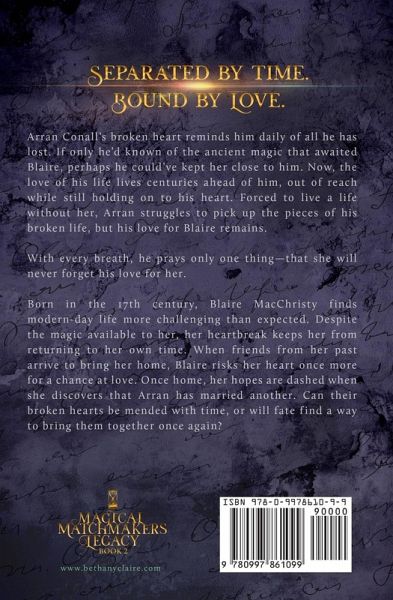 "Morna's Secret" is the SWEET/CLEAN version of "Love Beyond Reason" by USA TODAY Bestselling Author, Bethany Claire. This version is for readers who prefer clean language in their stories and love scenes that stay behind closed doors. If you prefer steamier romances, read the books in the original Morna's Legacy Series. Separated by time. Bound by love. Arran Conall's broken heart reminds him daily of all he has lost. If only he'd known of the ancient magic that awaited Blaire, perhaps he could've kept her close to him. Now, the love of his life lives centuries ahead of him, out of reach while still holding on to his heart. Forced to live a life without her, Arran struggles to pick up the pieces of his broken life, but his love for Blaire remains. With every breath, he prays only one thing-that she will never forget his love for her. Born in the 17th century, Blaire MacChristy finds modern-day life more challenging than expected. Despite the magic available to her, her heartbreak keeps her from returning to her own time. When friends from her past arrive to bring her home, Blaire risks her heart once more for a chance at love. When she returns, her hopes are dashed when she discovers that Arran has married another. Can their broken hearts be mended with time, or will fate find a way to bring them together once again? Read all the books in The Magical Matchmaker's Legacy: Morna's Spell Morna's Secret The Conalls' Magical Yuletide - A Novella Morna's Magic Morna's Accomplice Jeffrey's Only Wish - A Novella Morna's Rogue Morna's Ghost Morna's Vow
