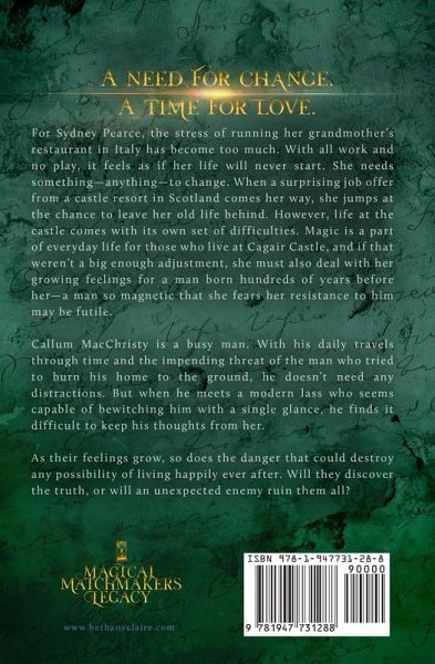 "Morna's Vow" is the SWEET/CLEAN version of "Love Beyond Belief" by USA TODAY Bestselling Author, Bethany Claire. This version is for readers who prefer clean language in their stories and love scenes that stay behind closed doors. If you prefer steamier romances, read the books in the original Morna's Legacy Series. A need for change. A time for love. For Sydney Pearce, the stress of running her grandmother’s restaurant in Italy has become too much. With all work and no play, it feels as if her life will never start. She needs something—anything—to change. When a surprising job offer from a castle resort in Scotland comes her way, she jumps at the chance to leave her old life behind. However, life at the castle comes with its own set of difficulties. Magic is a part of everyday life for those who live at Cagair Castle, and if that weren’t a big enough adjustment, she must also deal with her growing feelings for a man born hundreds of years before her—a man so magnetic that she fears her resistance to him may be futile. Callum MacChristy is a busy man. With his daily travels through time and the impending threat of the man who tried to burn his home to the ground, he doesn’t need any distractions. But when he meets a modern lass who seems capable of bewitching him with a single glance, he finds it difficult to keep his thoughts from her. As their feelings grow, so does the danger that could destroy any possibility of living happily ever after. Will they discover the truth, or will an unexpected enemy ruin them all? Read all the books in The Magical Matchmaker's Legacy: Morna's Spell Morna's Secret The Conalls' Magical Yuletide - A Novella Morna's Magic Morna's Accomplice Jeffrey's Only Wish - A Novella Morna's Rogue Morna's Ghost Morna's Vow