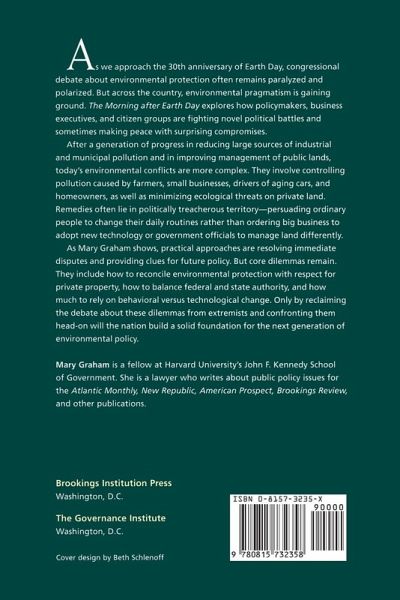 "A Brookings Institution Press and Governance Institute publication As we approach the 30th anniversary of Earth Day (the first of its kind was April 1970), congressional debate about environmental protection often remains paralyzed and polarized. But across the country, environmental pragmatism is gaining ground. The Morning after Earth Day explores how policymakers, business executives, and citizen groups are fighting novel political battles and sometimes making peace with surprising compromises. After a generation of progress in reducing large sources of industrial and municipal pollution and in improving management of public lands, today's environmental conflicts are more complex. They involve controlling pollution caused by farmers, small businesses, drivers of aging cars, and homeowners, as well as minimizing ecological threats on private land. Remedies often lie in politically treacherous territory--persuading ordinary people to change their daily routines rather than ordering big business to adopt new technology or government officials to manage land differently. As Mary Graham shows, practical approaches are resolving immediate disputes and providing clues for future policy. But core dilemmas remain. They include how to reconcile environmental protection with respect for private property, how to balance federal and state authority, and how much to rely on behavioral versus technological change. Only by reclaiming the debate about these dilemmas from extremists and confronting them head-on will the nation build a solid foundation for the next generation of environmental policy."