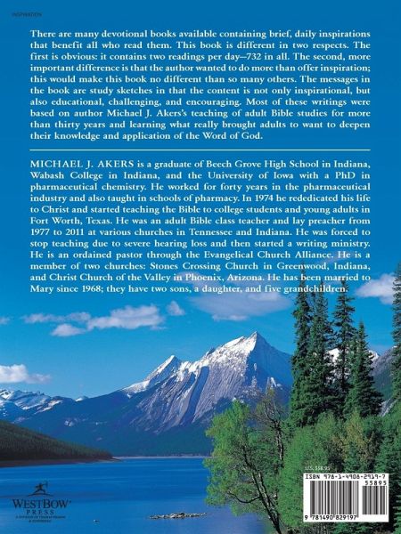There are many devotional books available containing brief, daily inspirations that benefit all who read them. This book is different in two respects. The first is obvious: it contains two readings per day-732 in all. The second, more important difference is that the author wanted to do more than offer inspiration; this would make this book no different than so many others. The messages in the book are study sketches in that the content is not only inspirational, but also educational, challenging, and encouraging. Most of these writings were based on author Michael J. Akers's teaching of adult Bible studies for more than thirty years and learning what really brought adults to want to deepen their knowledge and application of the Word of God.