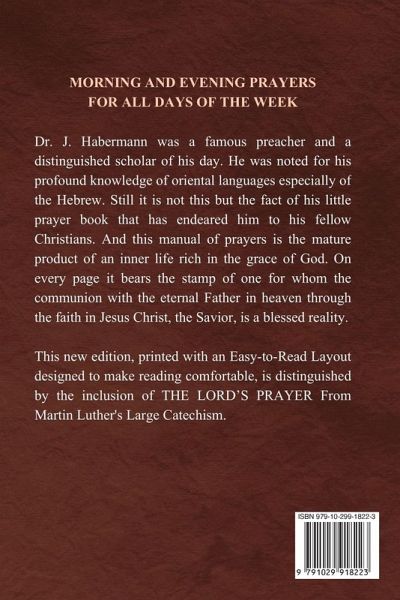 Morning and Evening Prayers for All Days of the Week. Together With Confessional, Communion, and Other Prayers and Hymns. New edition with the inclusion of THE LORD'S PRAYER From Martin Luther's Large Catechism.