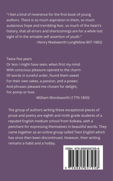 ""I feel a kind of reverence for the first book of young authors. There is so much aspiration in them, so much audacious hope and trembling fear, so much of the heart's history, that all errors and shortcomings are for a while lost sight of in the amiable self assertion of youth."" -Henry Wadsworth Longfellow 807-1882) Twice five years Or less I might have seen, when first my mind With conscious pleasure opened to the charm Of words in tuneful order, found them sweet For their own sakes, a passion, and a power; And phrases pleased me chosen for delight, For pomp or love. -William Wordsworth (1770-1850)