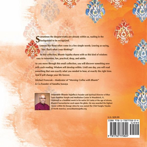 Sometimes the deepest truths are already within us, waiting in the background to be recognized. Lessons like these often come in a few simple words. Leaving us saying, "Yes! That's what I was thinking!" In this collection, Bhante Sujatha shares with us this kind of wisdom: easy to remember, fun, practical, deep, and subtle. "As you move through this small collection, you will discover something new with each reading. Wisdom will develop within. Until one day, you will read something that was exactly what you needed to hear, at exactly the right time. And it will change your life forever." --Michael Fronczak, Moderator of Morning Coffee with Bhante & Co-Founder of Sanatha Suwaya