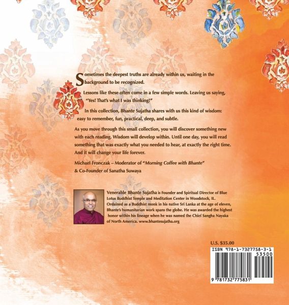 Sometimes the deepest truths are already within us, waiting in the background to be recognized. Lessons like these often come in a few simple words. Leaving us saying, "Yes! That's what I was thinking!" In this collection, Bhante Sujatha shares with us this kind of wisdom: easy to remember, fun, practical, deep, and subtle. "As you move through this small collection, you will discover something new with each reading. Wisdom will develop within. Until one day, you will read something that was exactly what you needed to hear, at exactly the right time. And it will change your life forever." --Michael Fronczak, Moderator of Morning Coffee with Bhante & Co-Founder of Sanatha Suwaya