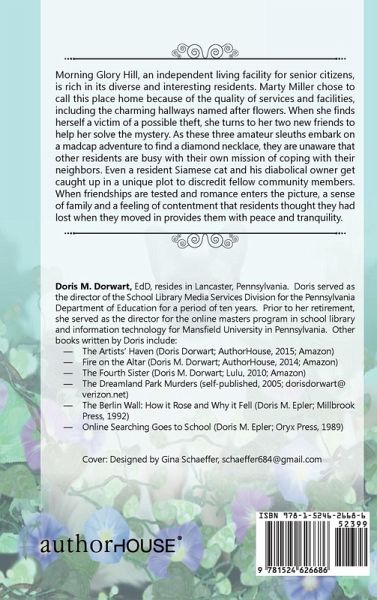 Morning Glory Hill, an independent living facility for senior citizens, is rich in its diverse and interesting residents. Marty Miller chose to call this place home because of the quality of services and facilities, including the charming hallways named after flowers. When she finds herself a victim of a possible theft, she turns to her two new friends to help her solve the mystery. As these three amateur sleuths embark on a madcap adventure to find a diamond necklace, they are unaware that other residents are busy with their own mission of coping with their neighbors. Even a resident Siamese cat and his diabolical owner get caught up in a unique plot to discredit fellow community members. When friendships are tested and romance enters the picture, a sense of family and a feeling of contentment that residents thought they had lost when they moved in provides them with peace and tranquility.