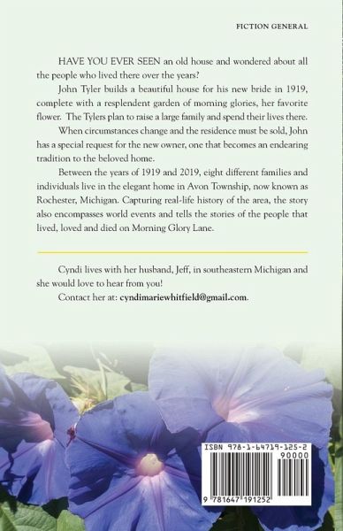 John Tyler builds a beautiful house for his new bride in 1919, complete with a resplendent garden of morning glories, her favorite flower. The Tylers plan to raise a large family and spend their lives there. ¿ When circumstances change and the residence must be sold, John has a special request for the new owner, one that becomes an endearing tradition to the beloved home. Between the years of 1919 and 2019, eight different families and individuals live in the elegant home in Avon Township, now known as Rochester, Michigan. Capturing real-life history of the area, the story also encompasses world events and tells the stories of the people that lived, loved and died on Morning Glory Lane.
