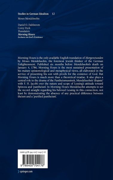 The last work published by Moses Mendelssohn during his lifetime, Morning Hours (1785) is also the most sustained presentation of his mature epistemological and metaphysical views, all elaborated in the service of presenting proofs for the existence of God. But Morning Hours is much more than a theoretical treatise. It also plays a central role in the drama of the Pantheismusstreit, Mendelssohn's "dispute" with F. H. Jacobi over the nature and scope of Lessing's attitude toward Spinoza and "pantheism". As the latest salvo in a war of texts with Jacobi, Morning Hours is also Mendelssohn's attempt to set the record straight regarding his beloved Lessing in this connection, not least by demonstrating the absence of any practical (i.e., religious or moral) difference between theism and a "purified pantheism".