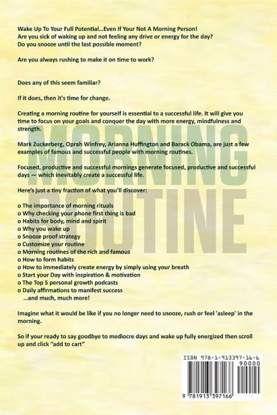 Wake Up To Your Full Potential…Even If Your Not A Morning Person! Are you sick of waking up and not feeling any drive or energy for the day? Do you snooze until the last possible moment? Are you always rushing to make it on time to work? Does any of this seem familiar? If it does, then it's time for change. Creating a morning routine for yourself is essential to a successful life. It will give you time to focus on your goals and conquer the day with more energy, mindfulness and strength. Mark Zuckerberg, Oprah Winfrey, Arianna Huffington and Barack Obama, are just a few examples of famous and successful people with morning routines. Focused, productive and successful mornings generate focused, productive and successful days - which inevitably create a successful life. Here's just a tiny fraction of what you'll discover: The importance of morning rituals Why checking your phone first thing is bad Habits for body, mind and spirit Why you wake up Snooze proof strategy Customize your routine Morning routines of the rich and famous How to form habits How to immediately create energy by simply using your breath Start your Day with inspiration & motivation ¿¿ The Top 5 personal growth podcasts Daily affirmations to manifest success …and much, much more! Imagine what it would be like if you no longer need to snooze, rush or feel 'asleep' in the morning. So if your ready to say goodbye to mediocre days and wake up fully energized then Read This Book