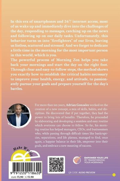In this era of smartphones and 24/7 internet access, most of us wake up and immediately dive into the challenges of the day, responding to messages, catching up on the news and following up on our daily tasks. Unfortunately, this behavior turns us into "firefighters" of our lives, leaving us listless, scattered and stressed. And we forget to dedicate a little time in the morning for the most important person in this world, which is you. The powerful process of Morning Zen helps you take back your mornings and start the day on the right foot. Through clear and easy-to-follow steps, the method shows you exactly how to establish the critical habits necessary to improve your health, energy, and attitude, to passionately pursue your goals and prepare yourself for the day's battles. For more than ten years, Adrian Gonzalez worked on the creation of a new concept, a mix of skills, habits, and disciplines. He discovered that if put together, they had the power to bring lots of benefits. Therefore, he proceeded by elaborating and developing a seamless and easy routine which everyone can choose to follow. So far, his morning routine has helped managers, CEOs, and businessmen who, while passing through difficult times like bankruptcies, separations, and life plateau, managed to find, once again, a happier balance in their life, empower into their goals, and embrace a new meaning of success.