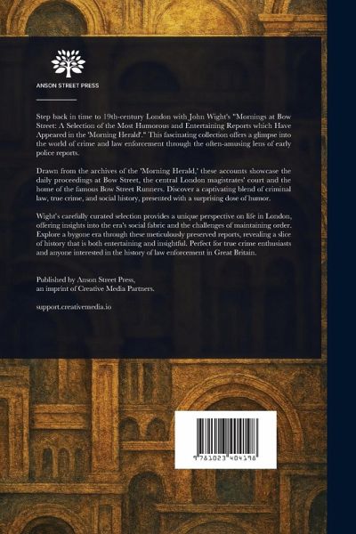 Step back in time to 19th-century London with John Wight's "Mornings at Bow Street: A Selection of the Most Humorous and Entertaining Reports which Have Appeared in the 'Morning Herald'." This fascinating collection offers a glimpse into the world of crime and law enforcement through the often-amusing lens of early police reports. Drawn from the archives of the 'Morning Herald, ' these accounts showcase the daily proceedings at Bow Street, the central London magistrates' court and the home of the famous Bow Street Runners. Discover a captivating blend of criminal law, true crime, and social history, presented with a surprising dose of humor. Wight's carefully curated selection provides a unique perspective on life in London, offering insights into the era's social fabric and the challenges of maintaining order. Explore a bygone era through these meticulously preserved reports, revealing a slice of history that is both entertaining and insightful. Perfect for true crime enthusiasts and anyone interested in the history of law enforcement in Great Britain. This work has been selected by scholars as being culturally important, and is part of the knowledge base of civilization as we know it. This work is in the public domain in the United States of America, and possibly other nations. Within the United States, you may freely copy and distribute this work, as no entity (individual or corporate) has a copyright on the body of the work. Scholars believe, and we concur, that this work is important enough to be preserved, reproduced, and made generally available to the public. We appreciate your support of the preservation process, and thank you for being an important part of keeping this knowledge alive and relevant.