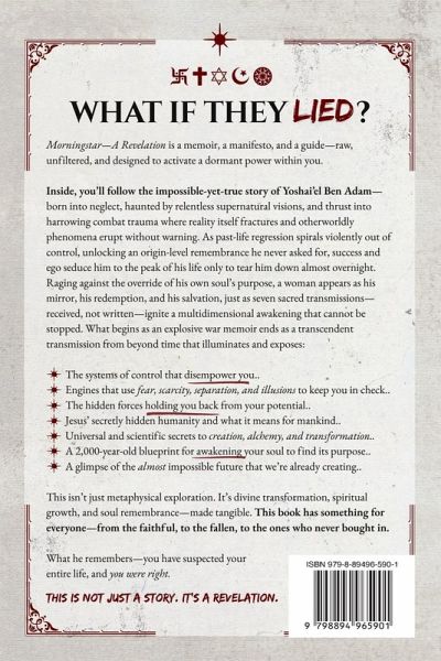 You know the name. Lucifer. For over 2,000 years, the Light Bringer has been buried, twisted, and demonized. But what if he was never the villain? Morningstar is not a self-help book. Not a spiritual memoir. Not a novel. It's an epic transmission. A radical, real revelation of the sacred-raw, unfiltered, and alive with fire. It doesn't offer a fairy tale. It indicts and dismantles the ones that keep you in the dark. The ones that leave you unhappy, unhealthy, unfulfilled-and always chasing what never delivers. Inside, you'll follow the almost-impossible true story of Yoshai'el Ben Adam. From a neglected childhood and the trauma of war, through depression, delusion, and near death-until he receives the Seven Resounds of Rebellion & Freedom, and the Thirteen Gospels of Lucifer. Just as his time is running out. What he remembers-you were never meant to forget.You'll become a witness to everything they tried to keep hidden. You'll uncover a spiritual framework built to endure any storm-and illuminate a system of sacred, subversive truths long buried by those who feared what they could never control. These are not metaphors. This is the revelation they never wanted you to hear.For the ones who left the church, the temple, the mosque-but never lost their faith. For the mystics. The heretics. The seekers. The exiles. For those who knew they weren't lost-just lied to. You were right. Now you'll understand why. There is a light inside you the world hoped you'd never find. And with this, it can be revealed.