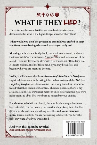 You know the name. Lucifer. For over 2,000 years, the Light Bringer has been buried, twisted, and demonized. But what if he was never the villain? Morningstar is not a self-help book. Not a spiritual memoir. Not a novel. It's an epic transmission. A radical, real revelation of the sacred-raw, unfiltered, and alive with fire. It doesn't offer a fairy tale. It indicts and dismantles the ones that keep you in the dark. The ones that leave you unhappy, unhealthy, unfulfilled-and always chasing what never delivers. Inside, you'll follow the almost-impossible true story of Yoshai'el Ben Adam. From a neglected childhood and the trauma of war, through depression, delusion, and near death-until he receives the Seven Resounds of Rebellion & Freedom, and the Thirteen Gospels of Lucifer. Just as his time is running out. What he remembers-you were never meant to forget.You'll become a witness to everything they tried to keep hidden. You'll uncover a spiritual framework built to endure any storm-and illuminate a system of sacred, subversive truths long buried by those who feared what they could never control. These are not metaphors. This is the revelation they never wanted you to hear.For the ones who left the church, the temple, the mosque-but never lost their faith. For the mystics. The heretics. The seekers. The exiles. For those who knew they weren't lost-just lied to. You were right. Now you'll understand why. There is a light inside you the world hoped you'd never find. And with this, it can be revealed.