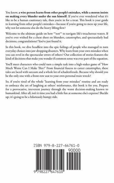 You know, a wise person learns from other people's mistakes, while a moron insists on making every blunder under the sun himself. If you've ever wondered what it's like to be a human cautionary tale, then you're in for a treat. This book is your guide to learning from other people's mistakes-because if you're going to mess up your life, why not let someone else do the heavy lifting first? Welcome to the ultimate guide on how **not** to navigate life's treacherous waters. If you've ever wished for a cheat sheet on blunders, catastrophes, and spectacularly bad decisions, congratulations! You've just found it. In this book, we dive headfirst into the epic failings of people who managed to turn everyday choices into jaw-dropping disasters. Why learn from your own mistakes when you can revel in the spectacular errors of others? Our collection of stories features the kind of decisions that make you wonder if common sense was ever part of the equation. You'll meet characters who could turn a simple task into a high-stakes game of "How Much Worse Can I Make This?" From financial fiascos to career catastrophes, these tales are laced with sarcasm and a whole lot of schadenfreude. Because why should you be the only one with a front-row seat to your own personal train wreck? So, if you're tired of the whole "learning from your mistakes" routine and are ready to embrace the art of laughing at others' misfortunes, this book is for you. Prepare for a provocative, irreverent journey through the worst decision-making known to humankind. After all, isn't it time you had a little fun at someone else's expense? Buckle up; it's going to be a hilariously bumpy ride.