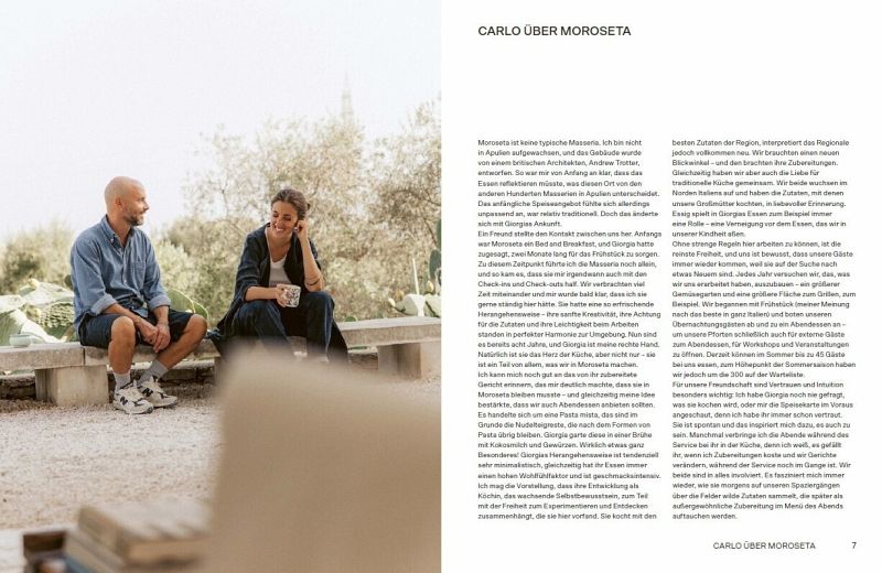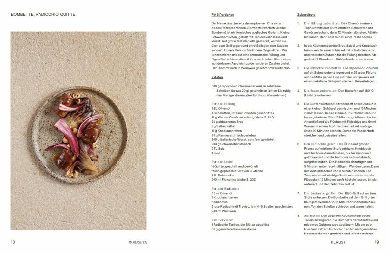 In jahreszeitliche Kapitel unterteilt, bietet Moroseta eine geschmackliche Reise voller Raffinesse begleitet von traditionellen Zutaten wie Zitrusfrüchten, Tomaten, Fenchel oder Basilikum durch die zeitgemäße apulische Landhausküche