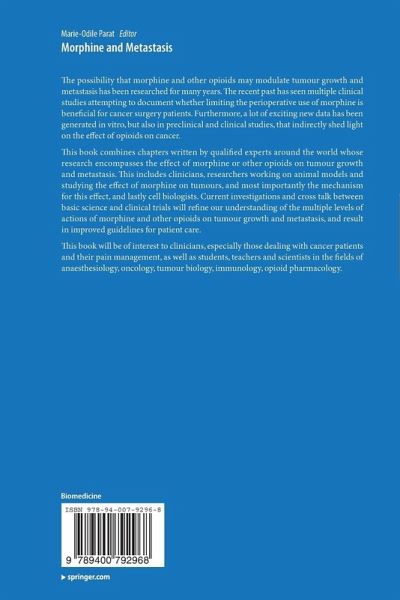 This book would combine chapters written by the most qualified authors around the world whose research encompasses the effect of morphine or other opioids on tumor growth and metastasis. This includes clinicians involved in trials determining which type of post surgical pain management can minimize the risk of recurrence or metastasis, researchers working on animal models and studying the effect of morphine on tumors, and most importantly the mechanism for this effect, and lastly cell biologists. There is currently a lot of research going on trying to reconcile the pro- and anti-cancer aspects of opioids actions.