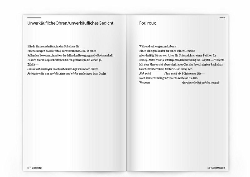 Morphine sind die stärksten natürlichen Schmerzmittel, Analgetika, die eingesetzt werden, um die biologische Funktion akuter Schmerzen, und bei chronischen Schmerzen das Schmerzempfinden zu lindern, um psychische und soziale Ursachen von Schmerz behandeln zu können. Was Mikael Vogel in seinen Gedichten entwirft, ist allerdings nicht eine Poetik der Beruhigung, der Betäubung - es ist eine Poetik der Aufregung, der Aufreibung. Morphine ist eine Erzeugung und Abbildung neuralgischer Punkte: Mikael Vogels Gedichte zeigen Schmerzpunkte, Schmerzfelder, Schmerzwelten auf und anstatt sie oberflächlich zu behandeln, sie zu überdecken, rücken die Morphine das Schmerzempfinden in den Mittelpunkt des Erlebens. Hierbei strahlen diese Gedichte in alle Gliedmaßen des Lesens aus: Die Referenzweite und die persönliche Umdeutung der Sprachlichkeit sowie das Infragestellen und Anklagen menschlicher Interaktionen, machen diese Morphine auch zu einem diagnostischen Werkzeug. Mikael Vogels Gedichte sind ein Antidot des Verdrängens, ein Gegenmittel zur Betäubung, ein Bekenntnis zum Schmerz. Zur unnachgiebigen Erkundung der Bedingungen und Möglichkeiten von Realität.