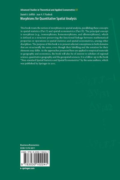 This book treats the notion of morphisms in spatial analysis, paralleling these concepts in spatial statistics (Part I) and spatial econometrics (Part II). The principal concept is morphism (e.g., isomorphisms, homomorphisms, and allomorphisms), which is defined as a structure preserving the functional linkage between mathematical properties or operations in spatial statistics and spatial econometrics, among other disciplines. The purpose of this book is to present selected conceptions in both domains that are structurally the same, even though their labelling and the notation for their elements may differ. As the approaches presented here are applied to empirical materials in geography and economics, the book will also be of interest to scholars of regional science, quantitative geography and the geospatial sciences. It is a follow-up to the book "Non-standard Spatial Statistics and Spatial Econometrics" by the same authors, which was published by Springer in 2011.