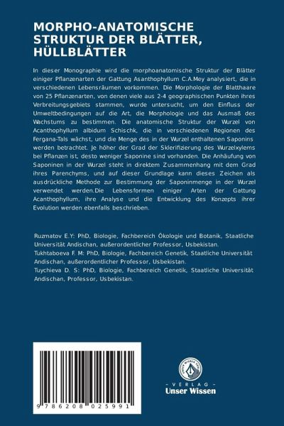 In dieser Monographie wird die morphoanatomische Struktur der Blätter einiger Pflanzenarten der Gattung Asanthophyllum C.A.Mey analysiert, die in verschiedenen Lebensräumen vorkommen. Die Morphologie der Blatthaare von 25 Pflanzenarten, von denen viele aus 2-4 geographischen Punkten ihres Verbreitungsgebiets stammen, wurde untersucht, um den Einfluss der Umweltbedingungen auf die Art, die Morphologie und das Ausmaß des Wachstums zu bestimmen. Die anatomische Struktur der Wurzel von Acanthophyllum albidum Schischk, die in verschiedenen Regionen des Fergana-Tals wächst, und die Menge des in der Wurzel enthaltenen Saponins werden betrachtet. Je höher der Grad der Sklerifizierung des Wurzelxylems bei Pflanzen ist, desto weniger Saponine sind vorhanden. Die Anhäufung von Saponinen in der Wurzel steht in direktem Zusammenhang mit dem Grad ihres Parenchyms, und auf dieser Grundlage kann dieses Zeichen als ausdrückliche Methode zur Bestimmung der Saponinmenge in der Wurzel verwendet werden.Die Lebensformen einiger Arten der Gattung Acanthophyllum, ihre Analyse und die Entwicklung des Konzepts ihrer Evolution werden ebenfalls beschrieben.