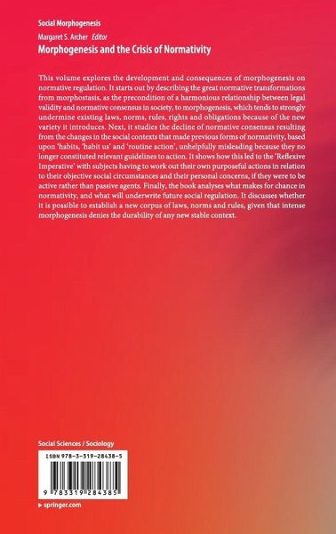 This volume explores the development and consequences of morphogenesis on normative regulation. It starts out by describing the great normative transformations from morphostasis, as the precondition of a harmonious relationship between legal validity and normative consensus in society, to morphogenesis, which tends to strongly undermine existing laws, norms, rules, rights and obligations because of the new variety it introduces. Next, it studies the decline of normative consensus resulting from the changes in the social contexts that made previous forms of normativity, based upon 'habits, 'habitus' and 'routine action', unhelpfully misleading because they no longer constituted relevant guidelines to action. It shows how this led to the 'Reflexive Imperative' with subjects having to work out their own purposeful actions in relation to their objective social circumstances and their personal concerns, if they were to be active rather than passive agents. Finally, the book analyses what makes for chance in normativity, and what will underwrite future social regulation. It discusses whether it is possible to establish a new corpus of laws, norms and rules, given that intense morphogenesis denies the durability of any new stable context.