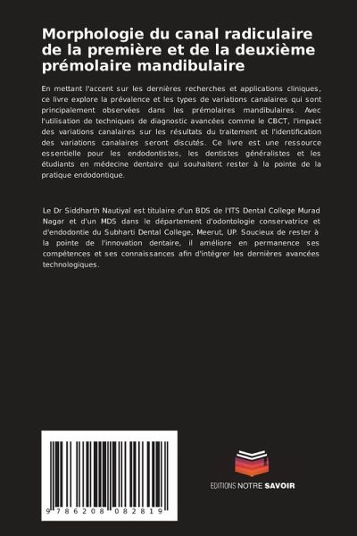 En mettant l'accent sur les dernières recherches et applications cliniques, ce livre explore la prévalence et les types de variations canalaires qui sont principalement observées dans les prémolaires mandibulaires. Avec l'utilisation de techniques de diagnostic avancées comme le CBCT, l'impact des variations canalaires sur les résultats du traitement et l'identification des variations canalaires seront discutés. Ce livre est une ressource essentielle pour les endodontistes, les dentistes généralistes et les étudiants en médecine dentaire qui souhaitent rester à la pointe de la pratique endodontique.