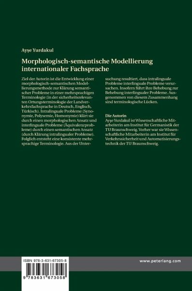 Ziel der Autorin ist die Entwicklung einer morphologisch-semantischen Modellierungsmethode zur Klärung semantischer Probleme in einer mehrsprachigen Terminologie (in der sicherheitsrelevanten Ortungsterminologie der Landverkehrsfachsprache in Deutsch, Englisch, Türkisch). Intralinguale Probleme (Synonymie, Polysemie, Homonymie) klärt sie durch einen morphologischen Ansatz und interlinguale Probleme (Äquivalenzprobleme) durch einen semantischen Ansatz (durch Klärung intralingualer Probleme). Folglich entsteht eine konsistente mehrsprachige Terminologie. Aus der Untersuchung resultiert, dass intralinguale Probleme interlinguale Probleme verursachen. Insofern führt ihre Behebung zur Behebung interlingualer Probleme. Ausgenommen von diesem Zusammenhang sind terminologische Lücken.