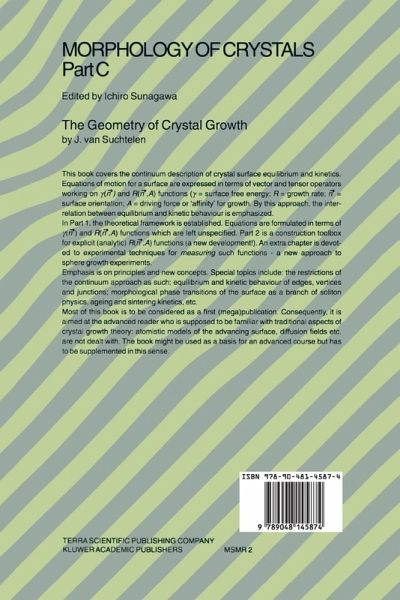 In Parts A: Fundamentals and B: Fine Particles, Minerals and Snow equilibrium and kinetic properties of crystals are generally approached from an `atomistic' point of view. In contrast, Part C: The Geometry of Crystal Growth follows the alternative and complementary `geometrical' description, where bulk phases are considered as continuous media and their interfaces as mathematical surfaces with orientation-dependent properties. Equations of motion for a crystal surface are expressed in terms of vector and tensor operators working on surface free energy and growth rate, both expressed as functions of surface orientation and driving force, or `affinity' for growth. This approach emphasizes the interrelation between equilibrium and kinetic behavior. Part 1 establishes the theoretical framework. Part 2 gives a construction toolbox for explicit (analytic) functions. An extra chapter is devoted to experimental techniques for measuring such functions: a new approach to sphere growth experiments. The emphasis throughout is on principles and new concepts.