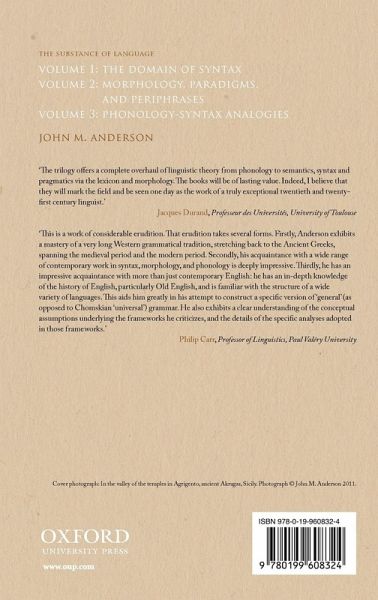 The three volumes of The Substance of Language collectively overhaul linguistic theory from phonology to semantics and syntax to pragmatics and offer a full account of how the form/function relationship works in language. Each explores the consequences for the investigation of language of a conviction that all aspects of linguistic structure are grounded in the non-linguistic mental faculties on which language imposes its own structure. The first and third look at how syntax and phonology are fed by a lexical component that includes morphology and which unites representations in the two planes. The second examines the way morphology is embedded in the lexicon as part of the expression of the lexicon-internal relationships of words. The Domain of Syntax explores the consequences for syntax of assuming that language is grounded in cognition and perception. It shows that syntax is characterized by a set of categories based on distinctions in what the categories are perceived to represent. The first part of the book traces the twentieth-century development of anti-notionalism, culminating in the assumption that syntax is autonomous. The author then looks at syntactic phenomena, many involving the fundamental notion of finiteness. He considers whether the appeal to grounding permits a lexicalist approach that would allow syntax to dispense not only with structural mutations such as category-change and 'empty categories' but with universal grammar itself. Morphology , Paradigms, and Periphrases is concerned with the role of the lexicon, in particular its inflectional morphology, in mediating between the substantively different categories of syntax and phonology. In the first part of the book Professor Anderson looks at the central role of the paradigm in reconciling the demands of syntactic categorization with the available means of expression. He examines the expressive role of inflection, illustrating his argument with Old English verb morphology. In the second part of the book the author pursues the notion of grammatical periphrasis. He starts out from its role as a solver of the problem of defective or incomplete paradigms and then compares it with other analytic expressions. He concludes with a discussion of why studies of grammatical periphrasis have focused on verbal constructions. He looks at the mechanism by which grammatical periphrases compensate for gaps in the finite verb paradigm and what this reveals about the substantive differences between verbs and nouns. Phonology-Syntax Analogies looks at the substantive and structural analogies betwem phonology and syntax and the factors that cause such analogies to break down. It considers the degree to which analogies between syntax and phonology result from their both being representational subsystems within the overall system of language. At the same time it examines how far semantic and phonetic properties limit such analogies. The book presents a powerful argument against the notion of an ungrounded autonomous syntax, which it sustains and supports by detailed grammatical analyses and a powerfully coherent conceptual understanding of the nature of language. The many detailed proposals of John Anderson's fine trilogy are derived from an over-arching conception of the nature of linguistic knowledge that is in turn based on the grounding of syntax in semantics and the grounding of phonology in phonetics, both convincingly subsumed under the notion of cognitive salience. The Substance of Language is a major contribution to linguistic theory and the history of linguistic thought.