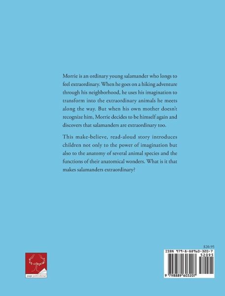 Morrie is an ordinary young salamander who longs to feel extraordinary. When he goes on a hiking adventure through his neighborhood, he uses his imagination to transform into the extraordinary animals he meets along the way. But when his own mother doesn't recognize him, Morrie decides to be himself again and discovers that salamanders are extraordinary too. This make-believe, read-aloud story introduces children not only to the power of imagination but also to the anatomy of several animal species and the functions of their anatomical wonders. What is it that makes salamanders extraordinary?