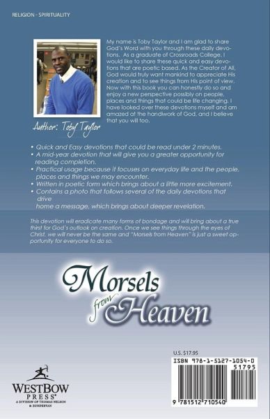 ¿ Quick and Easy devotions that could be read under 2 minutes. ¿ A mid-year devotion that will give you a greater opportunity for reading completion. ¿ Practical usage because it focuses on everyday life and the people, places and things we may encounter. ¿ Written in poetic form which brings about a little more excitement. ¿ Contains a photo that follows several of the daily devotions that drive home a message, which brings about deeper revelation. This devotion will eradicate many forms of bondage and will bring about a true thirst for God's outlook on creation. Once we see things through the eyes of Christ, we will never be the same and "Morsels from Heaven" is just a sweet opportunity for everyone to do so.