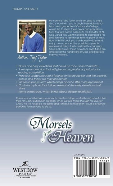 ¿ Quick and Easy devotions that could be read under 2 minutes. ¿ A mid-year devotion that will give you a greater opportunity for reading completion. ¿ Practical usage because it focuses on everyday life and the people, places and things we may encounter. ¿ Written in poetic form which brings about a little more excitement. ¿ Contains a photo that follows several of the daily devotions that drive home a message, which brings about deeper revelation. This devotion will eradicate many forms of bondage and will bring about a true thirst for God's outlook on creation. Once we see things through the eyes of Christ, we will never be the same and "Morsels from Heaven" is just a sweet opportunity for everyone to do so.