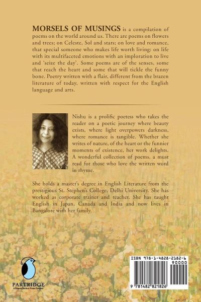 Morsels Of Musings is a compilation of poems on the world around us. There are poems on flowers and trees; on Celeste, Sol and stars; on love and romance, that special someone who makes life worth living: on life with its multi faceted emotions with an imploration to live and 'seize the day'. Some poems are of the senses, some that reach the heart and some that will tickle the funny bone. Poetry written with a flair, different from the brazen literature of today, written with respect for the English language and arts.