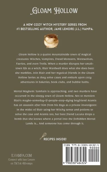 Stars Hollow meets Halloweentown in this new cozy witch mystery series from #1 bestselling author, Jane Lenore (J.L.) Vampa Gloam Hollow is a quaint mountainside town of magical creatures---witches, vampires, dread monsters, werewolves, faeries, and even trolls. When a murder disrupts her small-town life as a witch, Blair Wardwell does what she does best: she meddles. Join Blair and her mystical friends in the Gloam Hollow Series as they solve cases and embark upon cozy adventures in bakeries, book clubs, and bubble baths. Mortal Mayhem: Samhain is approaching, and two murders have occurred in the sleepy town of Gloam Hollow. Not to mention Blair's maybe-someday-if-people-stop-dying boyfriend Aramis has an assassin after him from his days as a private investigator. In the midst of Blair using her Witchy sense and potions to solve the case and Aramis too, her best friend Lacuna drops a bomb that she knows where a portal into the forbidden Mortal Lands is... And someone has come through it.