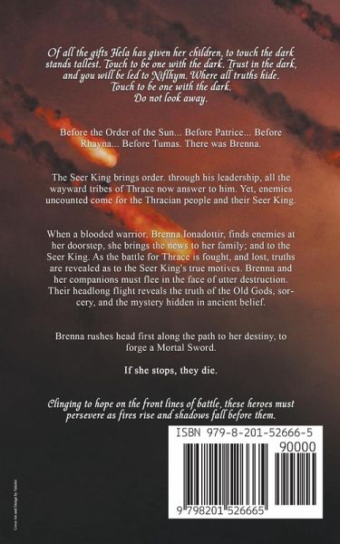 Of all the gifts Hela has given her children, to touch the dark stands tallest. Touch to be one with the dark. Trust in the dark, and you will be led to Niflhym. Where all truths hide. Touch to be one with the dark. Do not look away. Before the Order of the Sun... Before Patrice... Before Rhayna... Before Tumas. There was Brenna. The Seer King brings order. through his leadership, all the wayward tribes of Thrace now answer to him. Yet, enemies uncounted come for the Thracian people and their Seer King. When a blooded warrior, Brenna Ionadottir, finds enemies at her doorstep, she brings the news to her family; and to the Seer King. As the battle for Thrace is fought, and lost, truths are revealed as to the Seer King's true motives. Brenna and her companions must flee in the face of utter destruction. Their headlong flight reveals the truth of the Old Gods, and sorcery, and mystery hidden in ancient belief. Brenna rushes headfirst along the path to her destiny, to forge a Mortal Sword. If she stops, they die. Clinging to hope on the front lines of battle, these heroes must persevere as fires rise and shadows fall before them.