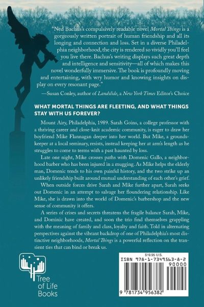 What mortal things are fleeting, and what stay with us forever? Mount Airy, Philadelphia, 1989. Sarah Goins, a college professor with a thriving career and close-knit academic community, is eager to draw her boyfriend Mike Flannagan deeper into her world. But Mike, a groundskeeper at a local seminary, resists, instead keeping her at arm's length as he struggles to come to terms with a past haunted by loss. Late one night, Mike crosses paths with Domenic Gallo, a neighborhood barber who has been injured in a mugging. As Mike helps the elderly man, Domenic tends to his own painful history, and the two strike up an unlikely friendship built around mutual understanding of each other's grief. When outside forces drive Sarah and Mike further apart, Sarah seeks out Domenic in an attempt to salvage her floundering relationship. Like Mike, she is drawn into the world of Domenic's barbershop and the new sense of community it offers. A series of crises and secrets threatens the fragile balance Sarah, Mike, and Domenic have created, and soon the trio find themselves grappling with the meaning of family and class, loyalty and faith. Told in alternating perspectives against the vibrant backdrop of one of Philadelphia's most distinctive neighborhoods, Mortal Things is a powerful reflection on the transient ties that can bind or break us. Ned Bachus's collection of short stories, City of Brotherly Love, was awarded the 2013 Independent Publisher Award (IPPY) Gold Medal for Literary Fiction. About the book, Sena Jeter Naslund, author of Ahab's Wife, said "[My] life is variously enriched by reading Ned Bachus's superb stories." The recipient of two fellowships from the Pennsylvania Council on the Arts, his 2017 book, Open Admissions: What Teaching at Community College Taught Me About Learning, was the product of his nearly four-decade career at Community