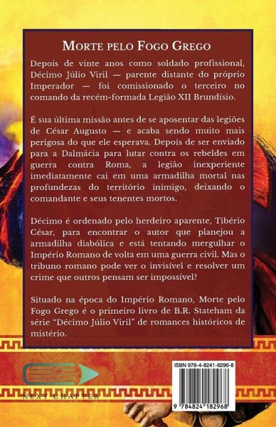 Depois de vinte anos como soldado profissional, Décimo Júlio Viril - parente distante do próprio Imperador - foi comissionado o terceiro no comando da recém-formada Legião XII Brundísio. É sua última missão antes de se aposentar das legiões de César Augusto - e acaba sendo muito mais perigosa do que ele esperava. Depois de ser enviado para a Dalmácia para lutar contra os rebeldes em guerra contra Roma, a legião inexperiente imediatamente cai em uma armadilha mortal nas profundezas do território inimigo, deixando o comandante e seus tenentes mortos. Décimo é ordenado pelo herdeiro aparente, Tibério César, para encontrar o autor que planejou a armadilha diabólica e está tentando mergulhar o Império Romano de volta em uma guerra civil. Mas o tribuno romano pode ver o invisível e resolver um crime que outros pensam ser impossível? Situado na época do Império Romano, Morte pelo Fogo Grego é o primeiro livro de B.R. Stateham da série "Décimo Júlio Viril" de romances históricos de mistério.