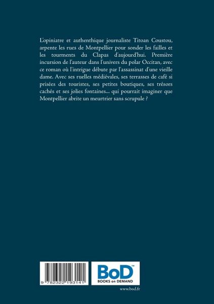 L'opiniatre et authenthique journaliste Titoan Coustou, arpente les rues de Montpellier pour sonder les failles et les tourments du Clapas d'aujourd'hui. Première incursion de l'auteur dans l'univers du polar Occitan, avec ce roman où l'intrigue débute par l'assassinat d'une vieille dame. Avec ses ruelles médiévales, ses terrasses de café si prisées des touristes, ses petites boutiques, ses trésors cachés et ses jolies fontaines... qui pourrait imaginer que Montpellier abrite un meurtrier sans scrupule ?