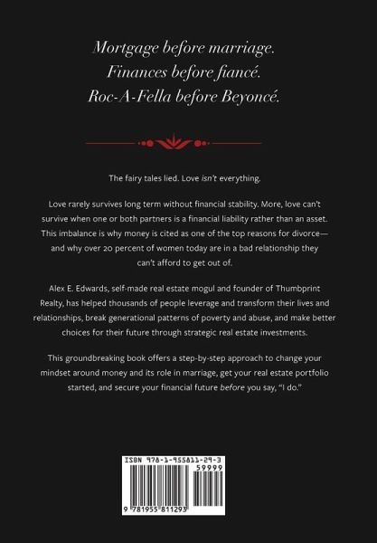 Mortgage before marriage. Finances before fiancé. Rockafella before Beyoncé. The fairy tales lied. Love isn't everything. Love rarely survives long term without financial stability. More, love can't survive when one or both partners is a financial liability rather than an asset. This imbalance is why money is cited as one of the top reasons for divorce - and why over 20 percent of women today are in a bad relationship they can't afford to get out of. Alex E. Edwards, self-made real estate mogul and founder of Thumbprint Realty, has helped thousands of people leverage and transform their lives and relationships, break generational patterns of poverty and abuse, and make better choices for their future through strategic real estate investments. This groundbreaking book offers a step-by-step approach to change your mindset around money and its role in marriage, get your real estate portfolio started, and secure your financial future before you say, "I do."