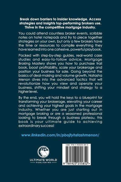 Break down barriers to insider knowledge. Access strategies and insights top-performing brokers use. Thrive in the competitive mortgage industry.You could attend countless broker events, scribble notes on hotel notepads and try to piece together strategies on your own, but only a few brokers have the time or resources to compile everything they have learned into one cohesive, powerful playbook.Packed with step-by-step guides, real-world case studies and easy-to-follow advice, Mortgage Broking Mastery shows you how to purchase trail book, boost profitability, scale your brokerage and position your business for sale. Going beyond the basics of deal-making and volume growth, Natasha Menon dives into the advanced tactics that will revolutionize how you view and operate your business, shifting your mindset and strategy to a higher level.By the end, you will hold the keys to a blueprint for transforming your brokerage, elevating your career and achieving your highest goals in the mortgage industry. Whether you are just starting out in mortgage broking or are a seasoned professional looking to break through a business plateau, this book is your ultimate guide to achieving extraordinary success!