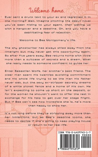 Welcome home. Ever sent a drunk text to your ex and regretted it in the morning? Well imagine pitching the debut novel you've been hiding to your agent, then waking up with a hangover and a deadline. Oh, and you have a debilitating fear of rejection. Welcome to Bee Montgomery's life. The shy ghostwriter has always shied away from the limelight, but she may never get this opportunity again. So after five years away, Bee returns home with little more than a suitcase of secrets and a dream. What she really needs is someone confident to guide her. Enter Sebastian Wolfe, her brother's best-friend. The older man spent his twenties avoiding commitment and his whole life trying to be the man his father never was, but the sexy ex-stripper secretly dreams of a white picket fence and a home of his own. He isn't expecting to come up short on the deposit, or for the woman he shouldn't want to offer the rest in exchange for his help to get over her stage-fright. But if Bee can't see how incredible she is, he'll just have to show her. It's not long before they're stripping away more than her inhibitions, but as Bee's deadline looms, she needs to decide if she's going to keep playing house or return to her real life.