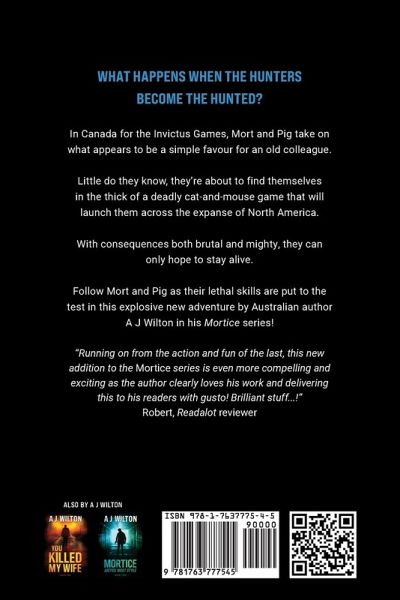 What happens when the hunters become the hunted? In Canada for the Invictus Games, Mort and Pig take on what appears to be a simple favour for an old colleague. Little do they know, they're about to find themselves in the thick of a deadly cat-and-mouse game that will launch them across the expanse of North America. With consequences both brutal and mighty, they can only hope to stay alive. Follow Mort and Pig as their lethal skills are put to the test in this explosive new adventure by Australian author A J Wilton in his Mortice series!