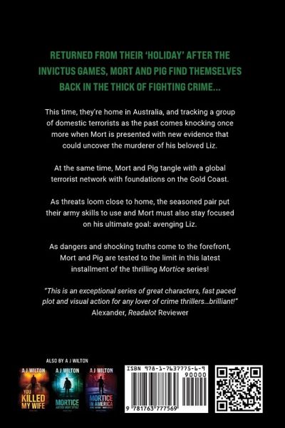Returned from their 'holiday' after the Invictus Games, Mort and Pig find themselves back in the thick of fighting crime... This time, they're home in Australia, tracking a group of domestic terrorists. The past comes knocking once more when Mort is presented with new evidence that could uncover the murderer of his beloved Liz. At the same time, Mort and Pig tangle with a global terrorist network with foundations on the Gold Coast. Threats loom close to home, and the seasoned pair put their army skills to use. But Mort must also stay focused on his ultimate goal: avenging Liz. As dangers and shocking truths come to the fore, Mort and Pig are tested to the limit in this latest installment of the thrilling Mortice series!