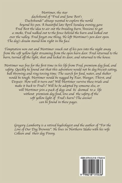 Mortimer, the star dachshund of Fred and Jane Best's Dachshunds always wanted to explore the world beyond his pen in their barn. A beautiful late April Sunday evening gave Fred the idea to air out the breeding barn. The night was gorgeous. Anxious to get a smoke, Fred walked out to the fence behind the barn and looked out over the valley while he smoked. Fred forgot one thing. He left Mortimer's gate open. Mortimer's dream of freedom stared him in the face. Temptation won out and the little dog snuck out of his pen into the night away from the incandescent light streaming from the open barn door. Fred returned to the barn, turned off the light, shut and locked its door, and returned to the house. Mortimer was free for the first time in his life from Fred, premium dog food, and safety. Quickly he found out that this adventure would not be peaches and cream. The search for food, water, and shelter, would be tough. Mortimer would be nagged by Fear, Hunger, Thirst, and Despair, many challenges in one huge ordeal. How will it turn out? Will Mortimer survive these trials and make it back to Fred's. Will he be adopted by someone else, or will Mortimer join a pack of dogs, doomed to a life without premium dog food? The answer will be found within these pages. Enjoy