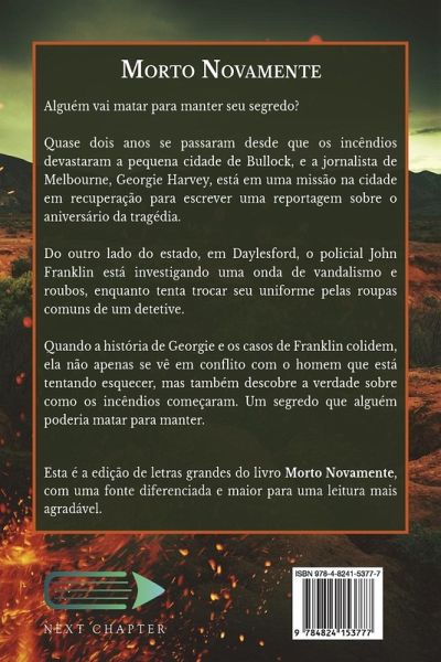 Alguém vai matar para manter seu segredo? Quase dois anos se passaram desde que os incêndios devastaram a pequena cidade de Bullock, e a jornalista de Melbourne, Georgie Harvey, está em uma missão na cidade em recuperação para escrever uma reportagem sobre o aniversário da tragédia. Do outro lado do estado, em Daylesford, o policial John Franklin está investigando uma onda de vandalismo e roubos, enquanto tenta trocar seu uniforme pelas roupas comuns de um detetive. Quando a história de Georgie e os casos de Franklin colidem, ela não apenas se vê em conflito com o homem que está tentando esquecer, mas também descobre a verdade sobre como os incêndios começaram. Um segredo que alguém poderia matar para manter. Edição impressa grande