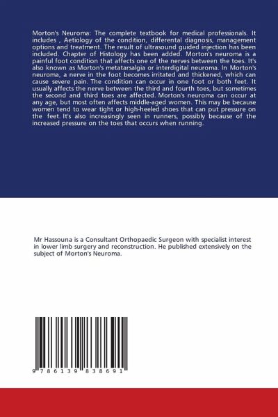 Morton's Neuroma: The complete textbook for medical professionals. It includes , Aetiology of the condition, differental diagnosis, management options and treatment. The result of ultrasound guided injection has been included. Chapter of Histology has been added. Morton's neuroma is a painful foot condition that affects one of the nerves between the toes. It's also known as Morton's metatarsalgia or interdigital neuroma. In Morton's neuroma, a nerve in the foot becomes irritated and thickened, which can cause severe pain. The condition can occur in one foot or both feet. It usually affects the nerve between the third and fourth toes, but sometimes the second and third toes are affected. Morton's neuroma can occur at any age, but most often affects middle-aged women. This may be because women tend to wear tight or high-heeled shoes that can put pressure on the feet. It's also increasingly seen in runners, possibly because of the increased pressure on the toes that occurs when running.