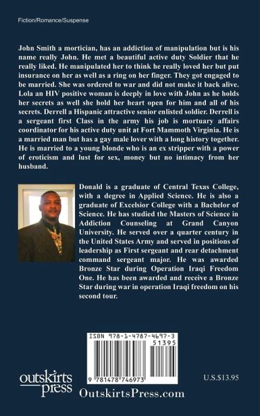 John Smith a mortician, has an addiction of manipulation but is his name really John. He met a beautiful active duty Soldier that he really liked. He manipulated her to think he really loved her but put insurance on her as well. He put a ring on her finger and they got engaged to be married. She was ordered to war and did not make it back alive. Lola an HIV positive woman is deeply in love with John as he holds her secrets as well she holds her heart open for him. Derrell a Hispanic attractive senior enlisted United States Army Soldier. Derrell is a Sergeant first Class in the army his job is mortuary affairs coordinator for his active duty unit at Fort Hood Texas. He is a married man but he has a gay male lover with a long history together. He is married to a young blonde who is an ex stripper with a power of eroticism and lust for sex, money but no intimacy from her husband. Joann is a military spouse with a goal to get a house through whatever means necessary. The funeral home is a resting place for those who have passed away but there are many different affairs happening in this mortuary.