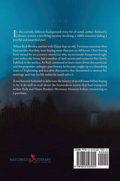 In this entirely different background story for of novel, author Richard J. Johnson weaves a terrifying mystery involving a 1880s mansion hiding a painful and unsettled past. When Rick Braden and his wife Elaine buy an old, Victorian mansion, they have no idea that they were buying more than just an old house. Once having been owned by an eccentric mortician who mysteriously disappeared eight years earlier, the house hid a number of dark secrets and mysteries that slowly bubbled to the surface. As Rick continued to learn more about the mortician and the properties unhappy past history, he became caught up in a disturbing maze of frightening and macabre discoveries that threatened to destroy his marriage and ruin his life unless he could solve it. If one has ever hesitated to delve into the history of an old house before buying it, he' d do well to read about the horrendous events that had transpired within Rick and Elaine Braden's Mortuary Mansion before committing to a purchase.