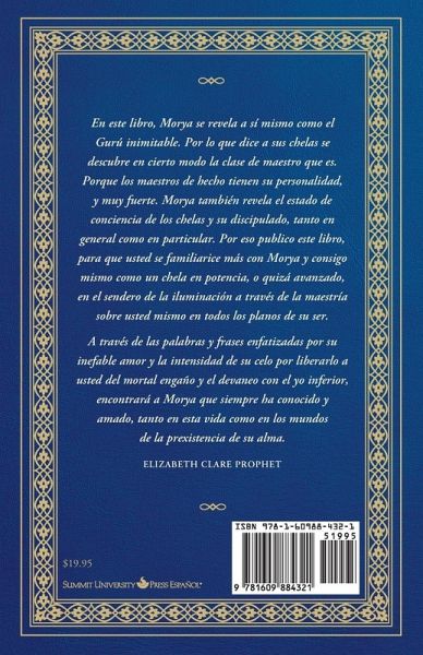 En este libro, Morya se revela a sí mismo como el Gurú inimitable. Por lo que dice a sus chelas se descubre en cierto modo la clase de maestro que es. Porque los maestros de hecho tienen su personalidad, y muy fuerte. Morya también revela el estado de conciencia de los chelas y su discipulado, tanto en general como en particular. Por eso publico este libro, para que usted se familiarice más con Morya y consigo mismo como un chela en potencia, o quizá avanzado, en el sendero de la iluminación a través de la maestría sobre usted mismo en todos los planos de su ser. A través de las palabras y frases enfatizadas por su inefable amor y la intensidad de su celo por liberarlo a usted del mortal engaño y el devaneo con el yo inferior, encontrará a Morya que siempre ha conocido y amado, tanto en esta vida como en los mundos de la prexistencia de su alma. ELIZABETH CLARE PROPHET