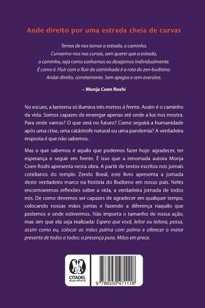 Ande direito por uma estrada cheia de curvas Temos de nos tornar a estrada, o caminho. Curvarmo-nos nas curvas, sem querer que a estrada, o caminho, seja como sonhamos ou desejamos individualmente. É como é. Fluir com o uir da caminhada é a rota do zen-budismo. Andar direito, corretamente. Sem apegos e sem aversões. ¿ Monja Coen Roshi No escuro, a lanterna só ilumina três metros à frente. Assim é o caminho da vida. Somos capazes de enxergar apenas até onde a luz nos mostra. Para onde vamos? O que será no futuro? Como seguirá a humanidade após uma crise, uma catástrofe natural ou uma pandemia? A verdadeira resposta é que não sabemos. Mas o que sabemos é aquilo que podemos fazer hoje: agradecer, ter esperança e seguir em frente. É isso que a renomada autora Monja Coen Roshi apresenta nesta obra. A partir de textos escritos nos jornais cotidianos do templo Zendo Brasil, este livro apresenta a jornada deste verdadeiro marco na história do Budismo em nosso país. Neles encontraremos refl exões sobre a vida, a verdadeira jornada de todos nós. De como devemos ser capazes de agradecer em qualquer tempo, colocando nossas mãos juntas e fazendo a diferença naquilo que podemos e onde estivermos. Não importa o tamanho de nossa ação, mas sim que ela seja realizada: Espero que você, leitor ou leitora, possa, assim como eu, colocar as mãos palma com palma e oferecer o maior presente de todos a todos: a presença pura. Mãos em prece.