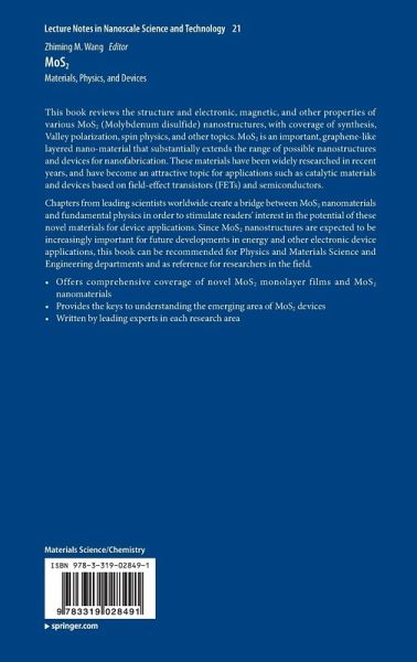 This book reviews the structure and electronic, magnetic, and other properties of various MoS2 (Molybdenum disulfide) nanostructures, with coverage of synthesis, Valley polarization, spin physics, and other topics. MoS2 is an important, graphene-like layered nano-material that substantially extends the range of possible nanostructures and devices for nanofabrication. These materials have been widely researched in recent years, and have become an attractive topic for applications such as catalytic materials and devices based on field-effect transistors (FETs) and semiconductors.